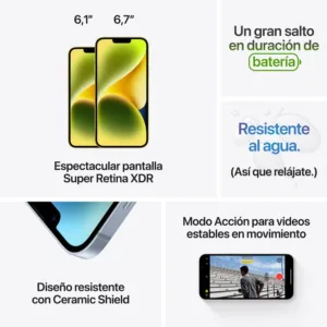 Cuenta con una pantalla Super Retina XDR de 6.1″, ideal para ver contenido con colores intensos y un brillo excepcional. Su cámara dual de 12 MP, con mejoras en fotografía con poca luz y grabación en modo Cine, te permite capturar cada momento como un profesional.